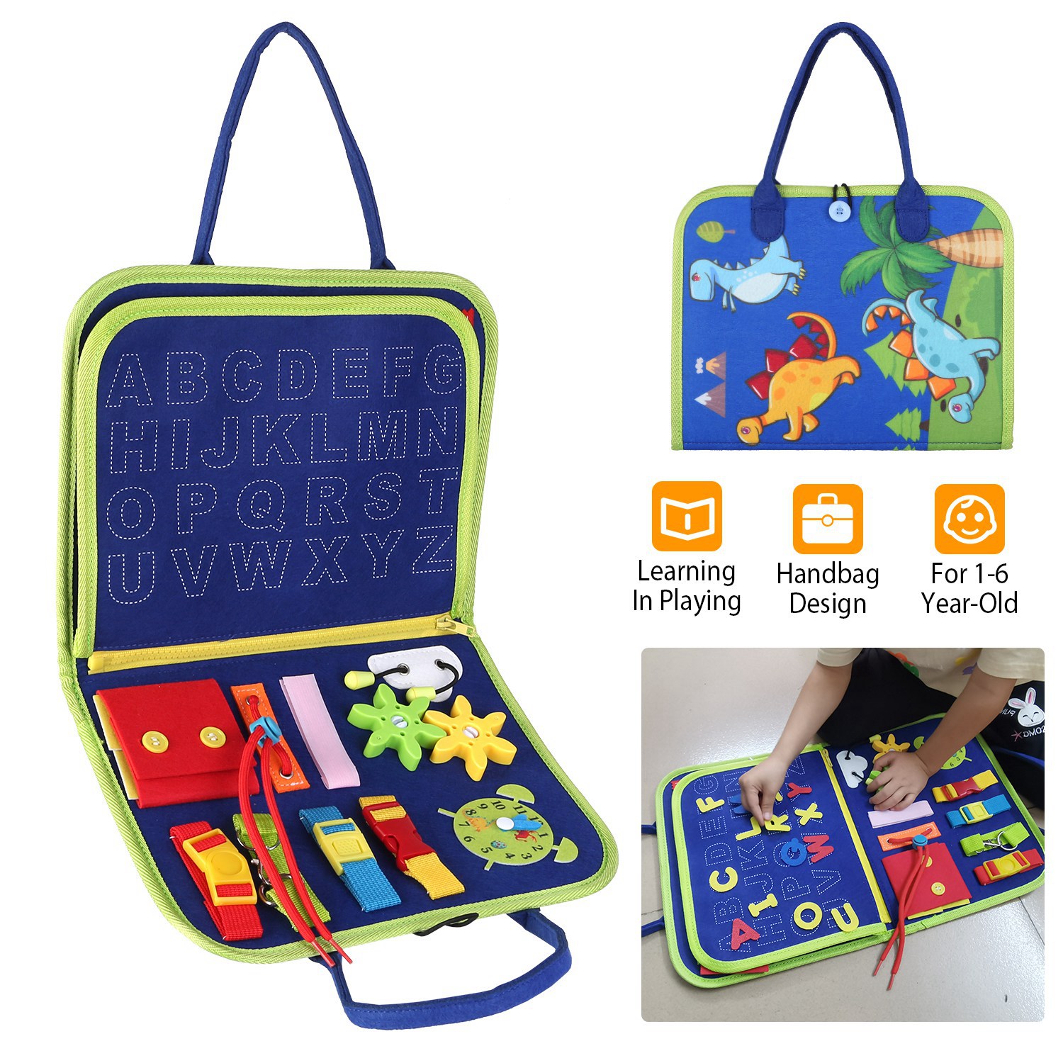 *Multifunctional Montessori Toys*:Designed with several types of buckles; clothing buttons; zippers; shoelaces; snap purse; drawstring; elastic strap in a foldable board; convenient for kids to learn great life lessons such as touch; turn; open; close; rotate; press; slide; switch; etc. and develop their hand-eye coordination.